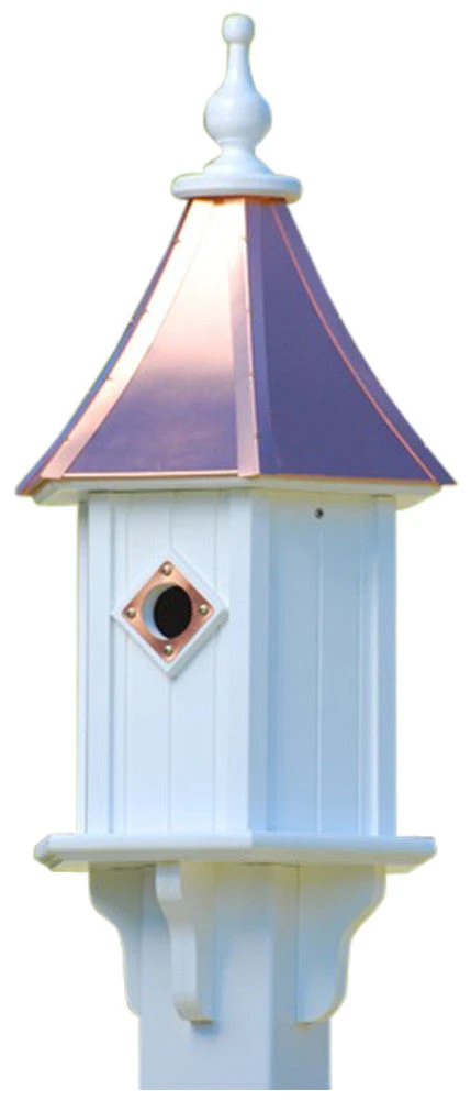 Traditional copper roof birdhouse is constructed of PVC/Vinyl and built to last. Roof remains bright and shiny for 3 to 4 years before even starting to weather.